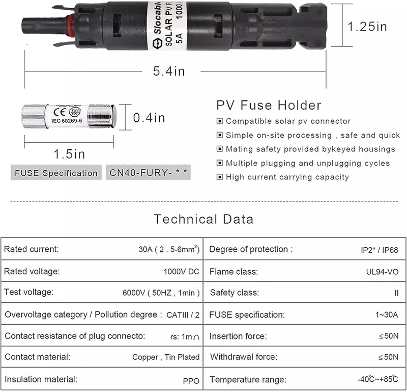 The MC Solar PV In-Line Fuse Holder is an essential safety accessory for any solar power system, providing reliable protection against overcurrent conditions that can damage panels, wiring, or inverters. Each unit includes a UL-listed fuse available in multiple amperage ratings (5A, 10A, 15A, 20A, 25A, 30A), allowing you to match the protection level to your system’s requirements.